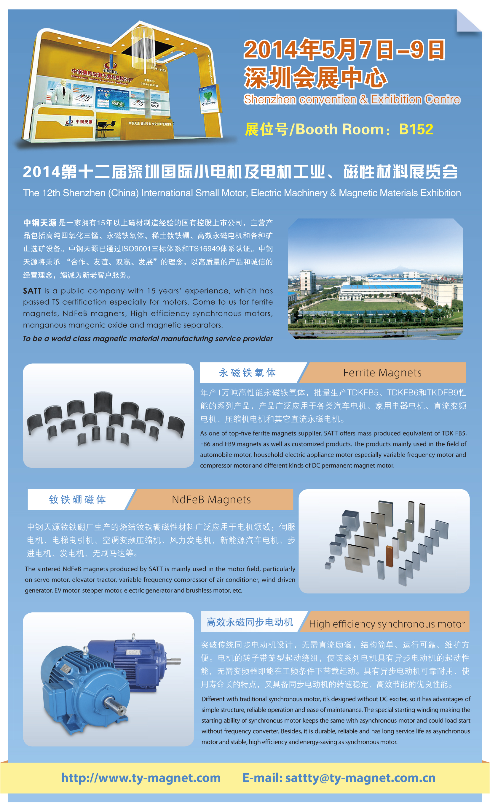 中鋼天源擬參加2014年第十二屆深圳國際電機及磁性材料展覽會,時間:2014年5月7日-9日,地點:深圳會展中心,展位號:B152,歡迎廣大客戶前來咨詢洽談!