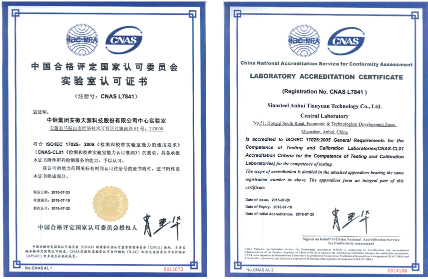 針對現(xiàn)場評審提出的問題和不符合項,公司中心實(shí)驗室經(jīng)過近3個月的整改,于2015年6月初將整改報告遞交至CNAS,CNAS確認(rèn)了申請認(rèn)可的多個檢測項目的檢測能力,并于2015年8月4日向中鋼天源中心實(shí)驗室頒發(fā)了CNAS認(rèn)可證書。