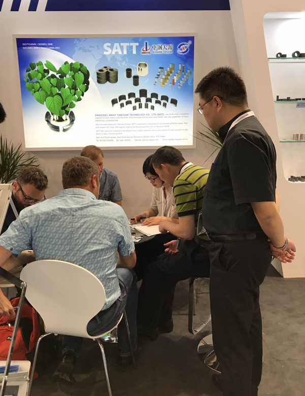本次展會,中鋼天源通過特裝展臺重點展出了鐵氧體磁瓦、釹鐵硼磁體和鐵氧體多極磁環(huán),成功吸引了新老客戶前來咨詢洽談。此次展會,不僅展示了良好的企業(yè)形象,提高了品牌的知名度,同時也穩(wěn)定、深化了客戶關(guān)系,結(jié)識了大量的潛在客戶,為今后國際市場的開拓奠定了良好的基礎(chǔ)。