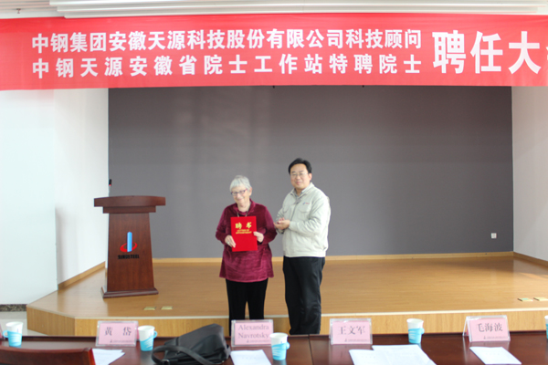 2018年3月15日下午,中鋼天源科技顧問暨中鋼天源安徽省院士工作站特聘院士聘任大會在公司總部第一培訓教室隆重召開。美國科學院院士Alexandra Navrotsky,中鋼新型董事長兼總經理黃岱、馬鞍山市科技局黨組書記白文化應邀出席會議,中鋼天源董事長、黨委書記王文軍、總經理毛海波等公司領導及高管、首席技術專家、技術骨干等50余人參加了會議。會議由毛海波總經理主持。